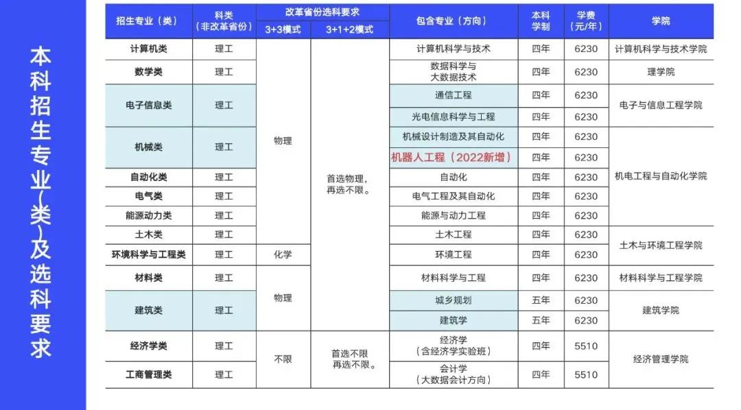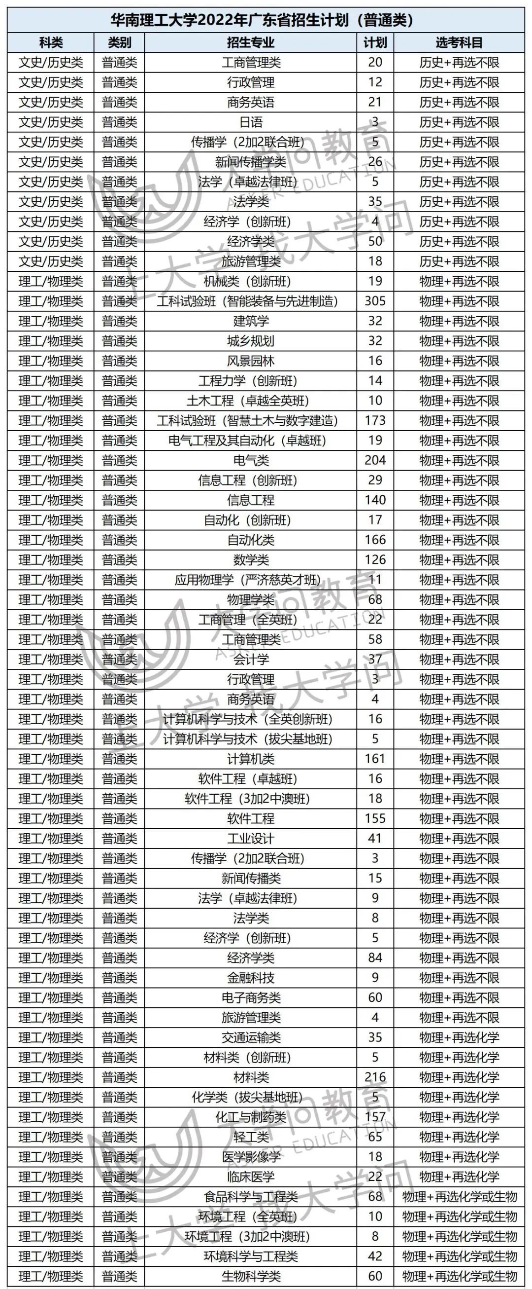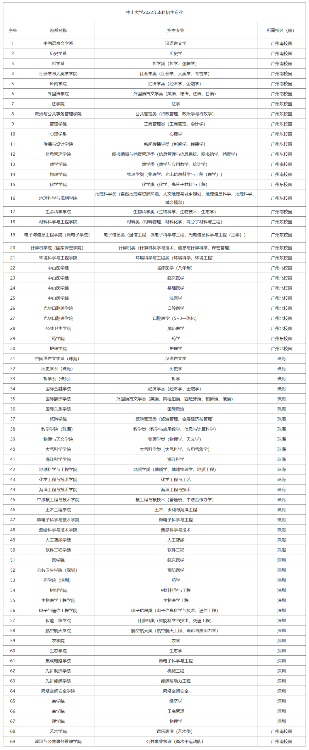 1 华南理工大学招生计划 2 2022华工招生政策 据了解,今年华南理工大学招生政策有以下几点调整,考生和家长们需特别留意: ①对高中学业水平考试要求有调整,去年按各省级招生考试机构公布执行(即在广东省,高中学考的选择考成绩计入高考总分,合格考成绩则合格即可),今年调整为结合学校实际情况确定学业水平考试要求及各省选考科目要求,报教育部备案后由各省级招生考试机构向社会公布。 ②在投档环节,认可各省份的投档分数(即高考成绩+加分),但最高加分不能超过20分。 ③在投档后的专业录取环节,按分数优先的原则,高分考生先安排其所填报的专业,不设置专业志愿级差。但分配专业时,不认高考加分。 ④平行志愿批次普通类专业:考生投档到学校后,服从调剂且符合专业录取要求者不退档。未招满人则安排补录。 ⑤填报这三个专业要特别注意:录取至建筑学、城乡规划、风景园林三个专业的考生,入校后需加试素描。 素描成绩不合格者参照学校当年各专业在生源地录取分数线及考生高考志愿,依据高考投档成绩,按照高分转低分的原则结合录取要求,调入新专业。不同意学校安排者将取消入学资格。 ⑥删除了“不能既报普通高考又报全国联招,否则取消录取”的规定。 ⑦学校本科外语教学中,非外语类专业主要采用英语教学,本科生英语水平必须达到学校的培养要求方可毕业。非英语语种的考生应慎重填报。 哈尔滨工业大学(深圳) 1 哈工大(深圳)招生规模 2 哈工大(深圳)招生专业及科目要求 3 广东省2022招生计划 中山大学 1 中山大学招生专业 2 中山大学招生要点